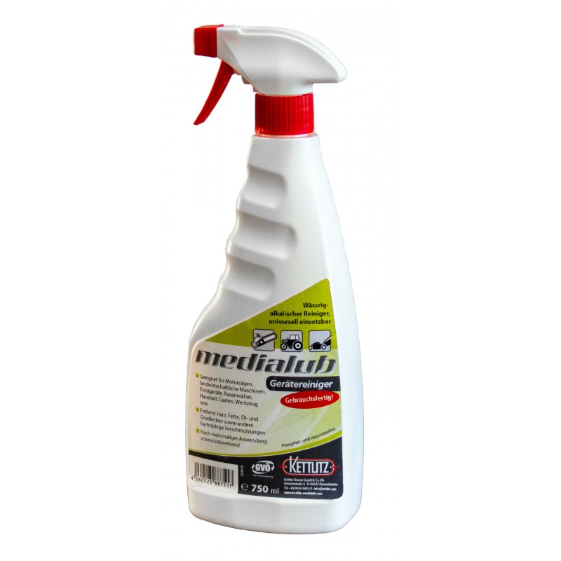 Medialub Gerätereiniger - Gebrauchsfertig ist ein effektiver Reiniger für die Reinigung von Motorsägen, Harvesteraggregaten und landwirtschaftlichen Maschinen. Mit seiner alkalischen Formel entfernt er mühelos hartnäckige Harz-, Öl- und Fettverschmutzungen von allen Oberflächen.